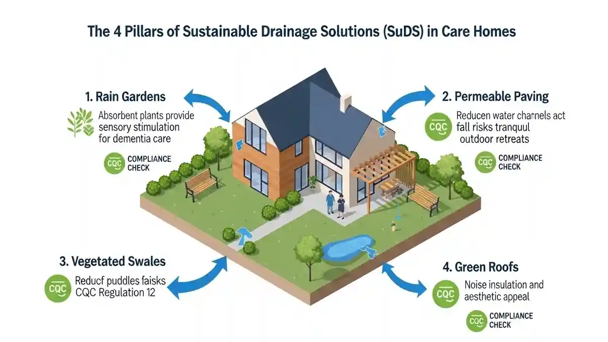 The future of sustainable drainage solutions CQC care home design is the integration of SuDS (Sustainable Drainage Systems). In Hythe, Policy EN18 of the Local Plan encourages SuDS to manage surface water runoff, which often plagues the surrounding area.